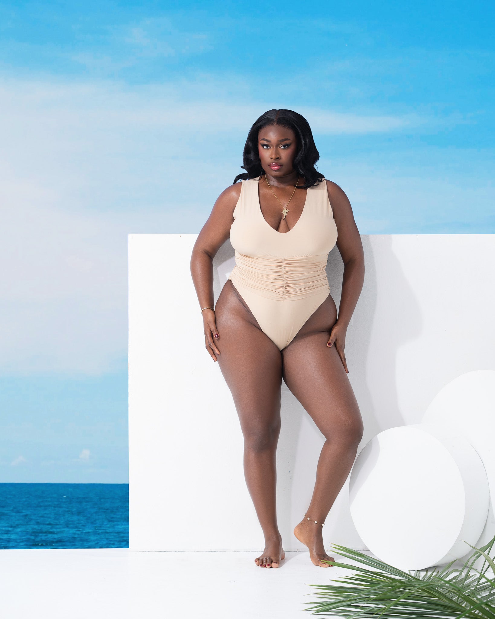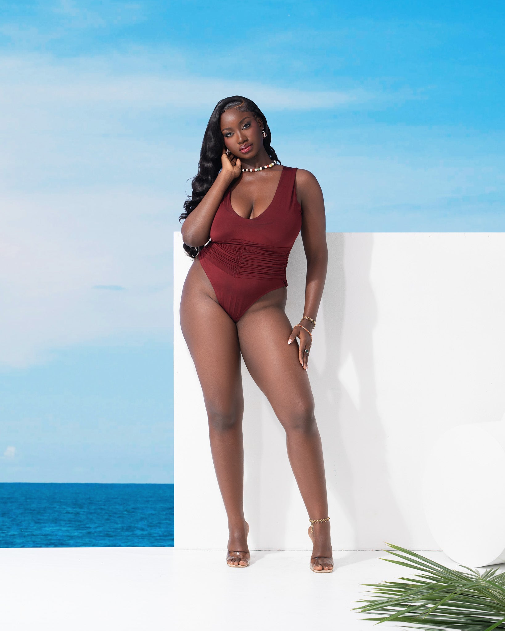 This scrunched-at-the-waist luxury swimsuit blends bold elegance with refined detail. Crafted from premium, stretchy fabric with a luxurious sheen, it offers a sculpted fit that accentuates the figure.